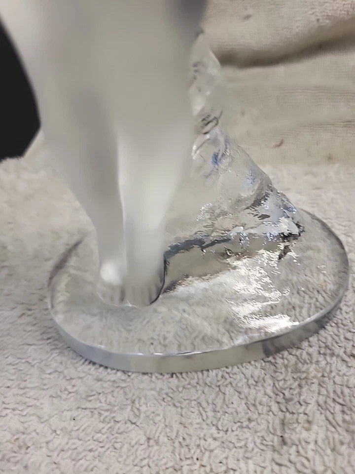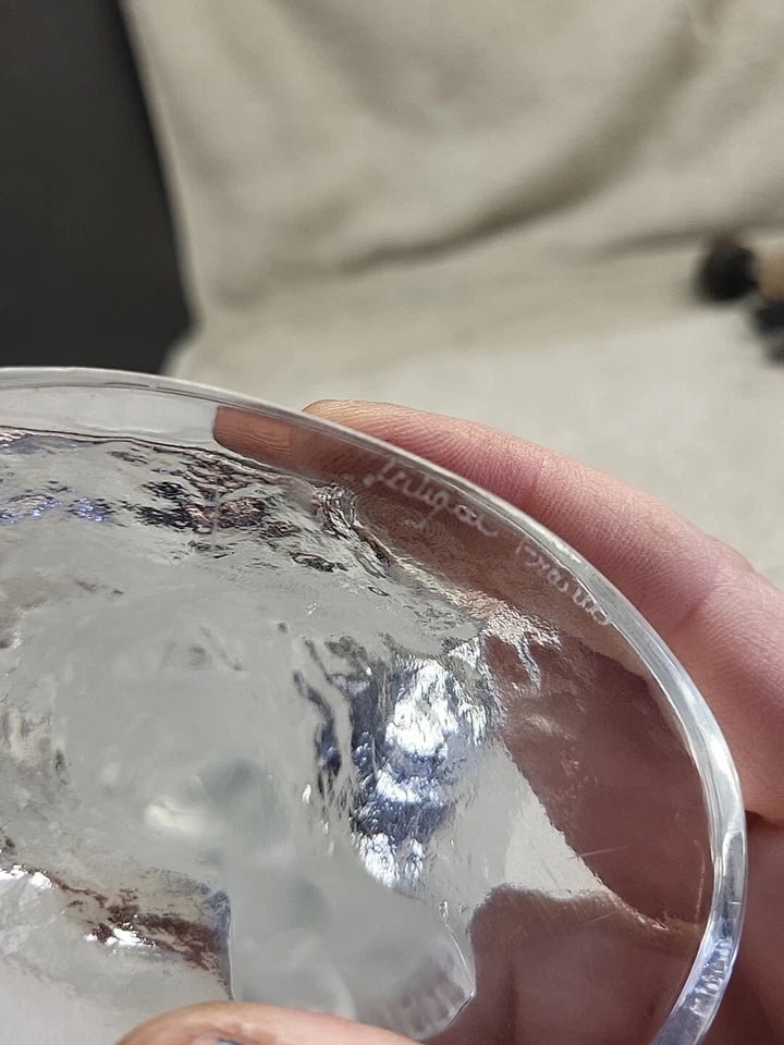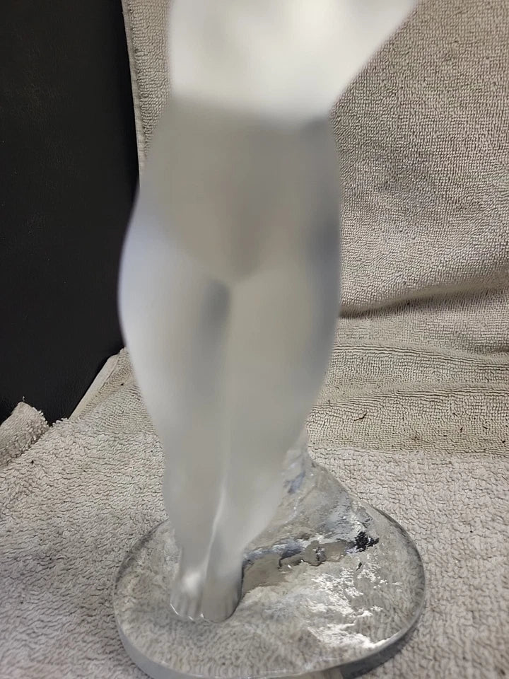 This Lalique Danseuse figurine, crafted by M Lalique in 1995, showcases a nude dancer with her arms raised in a graceful pose. The crystal material and clear color make it a stunning decorative piece for any collector, while the French origin and Lalique signature add to its value. Handmade with intricate details, this figurine stands at 9.5 inches tall and has a length of 3.25 inches and width of 4.5 inches. It's a vintage item that portrays the theme of dance and would be a great addition to any collection.