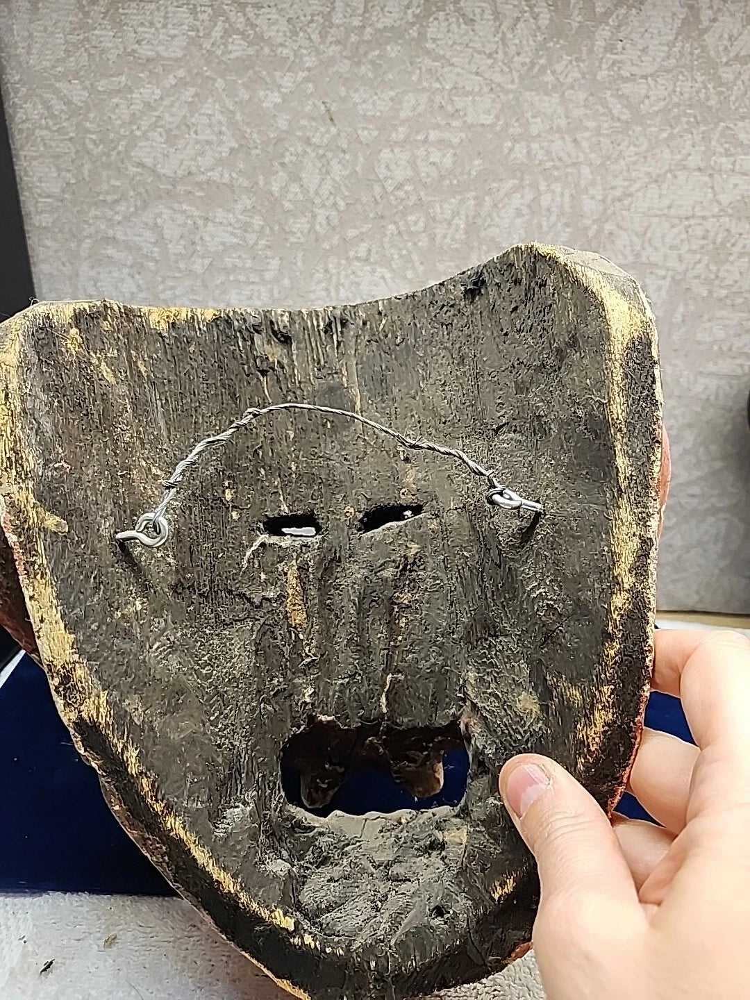 This product is a handmade Mexican folk art mask from Guerrero, Mexico. The mask is carved from wood and painted with various colors including green, red, black, orange, yellow, white, and sienna. It features a bearded man's face with a devil-like appearance and is decorated with gesso and pigment. The mask is a decorative piece that can be used as wall art or as a mask for traditional dances and festivals.