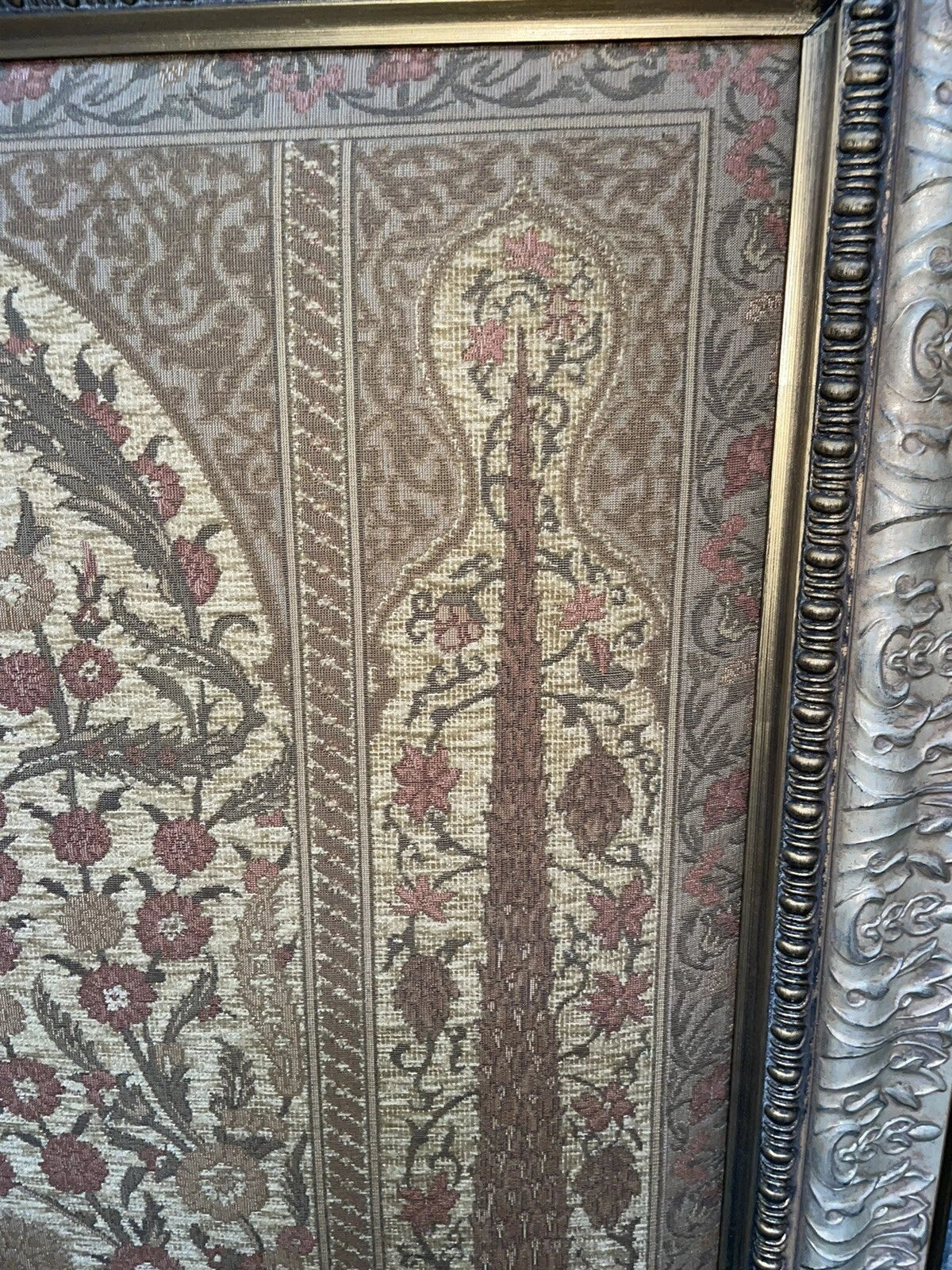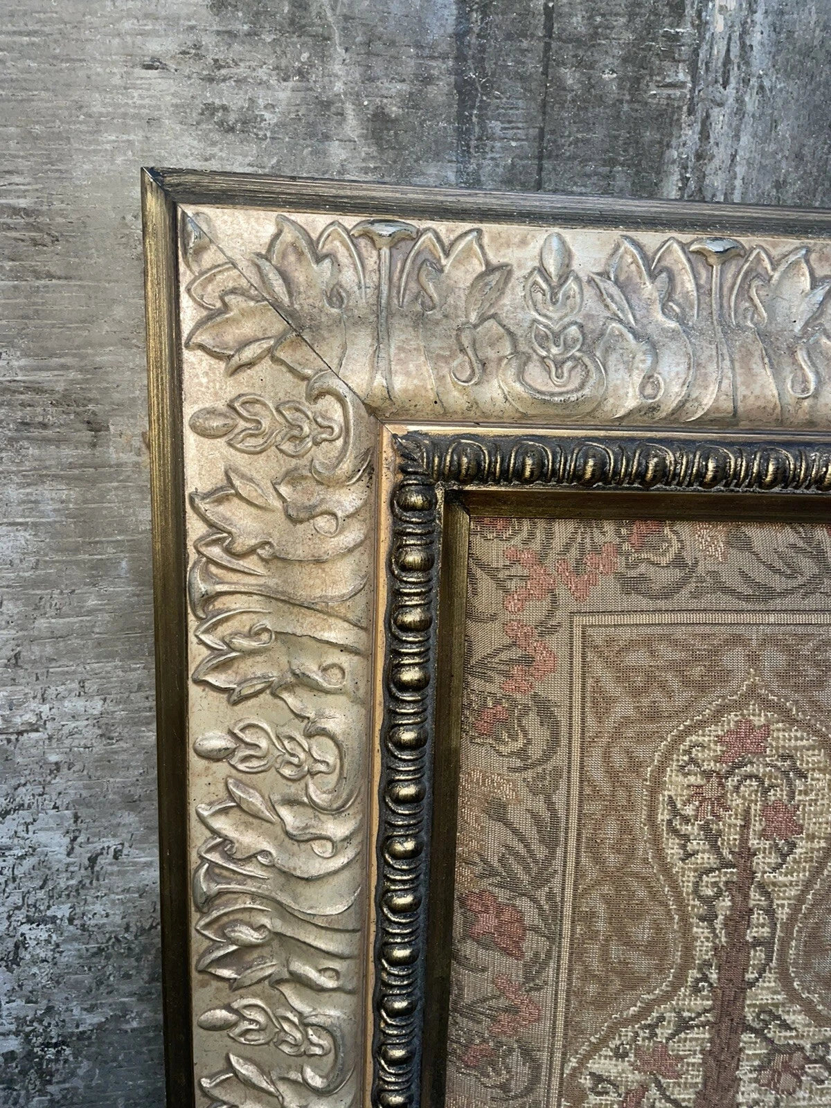 Vintage tapestry professionally framed and padded in a very nice ornate gold toned wood frame.