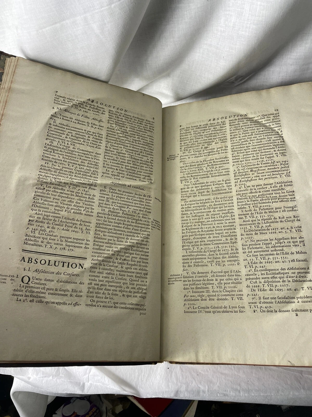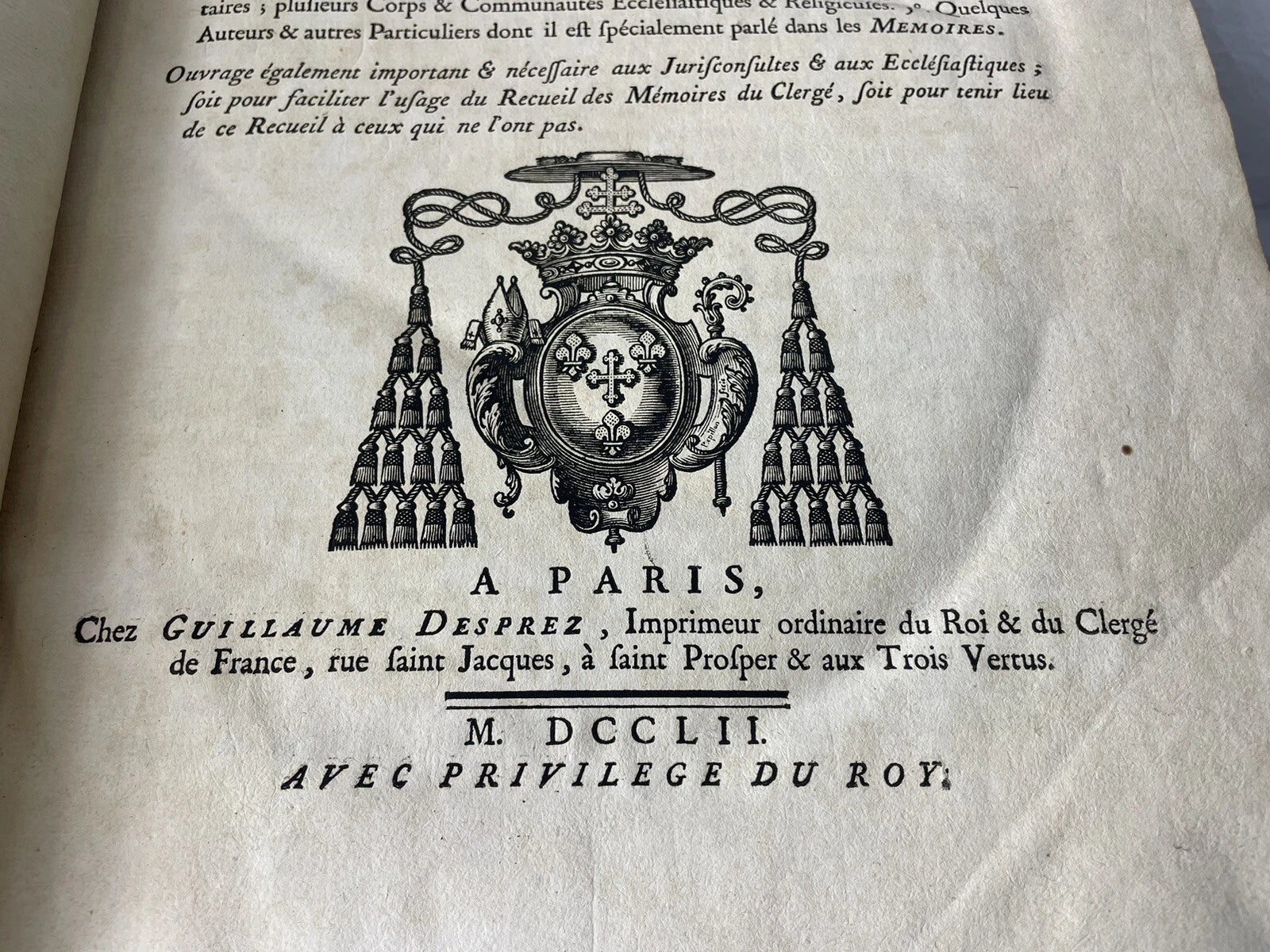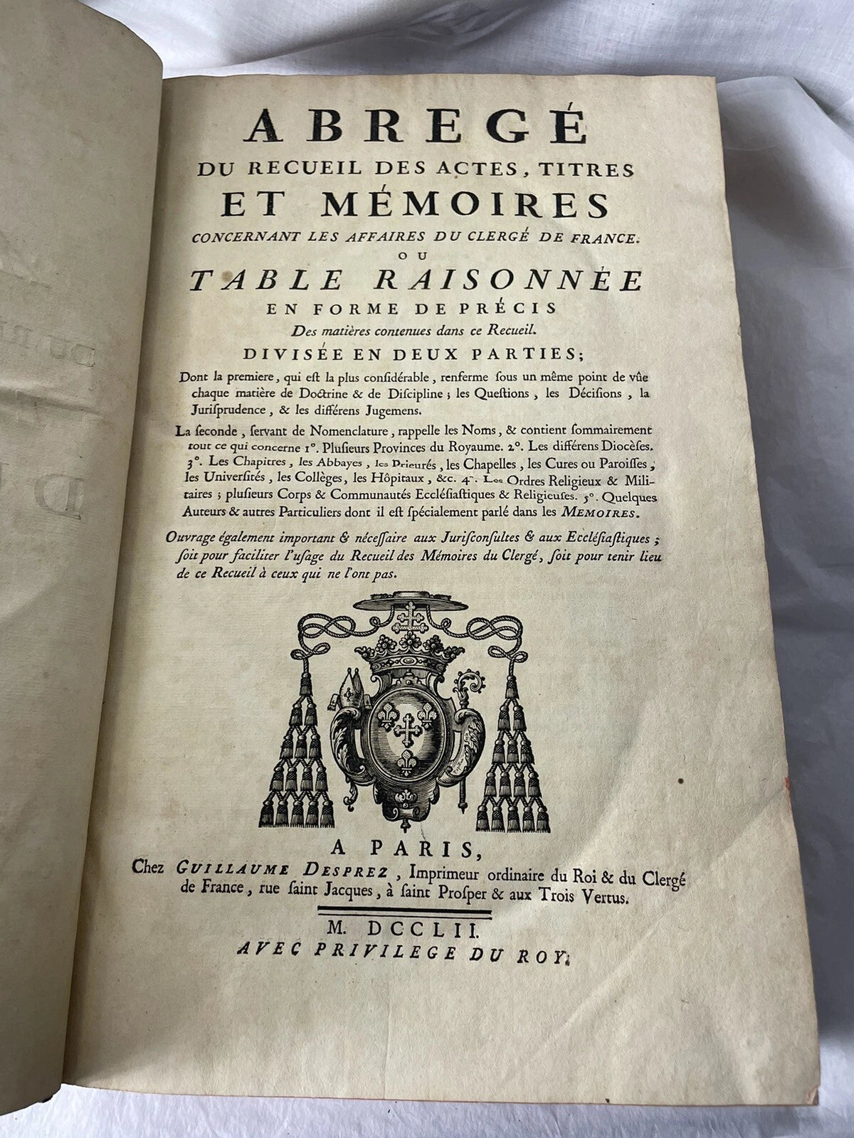 Large antique 1752 book on the acts, laws and memories of the French clergy. In good condition