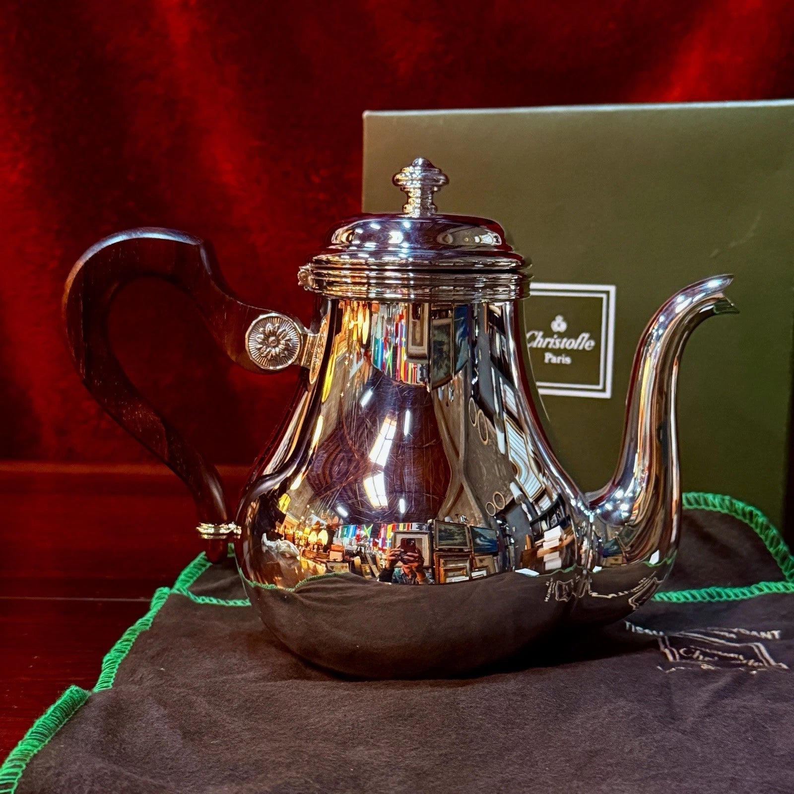 The teapot’s classical design features a gracefully curved spout, domed lid with decorative finial, and signature Christofle medallion detail on the body. The rosewood handle provides heat insulation and comfortable pouring control while adding warmth and visual contrast to the brilliant silver finish. The generous eight-cup capacity makes this piece suitable for entertaining while maintaining refined proportions appropriate for formal tea service.