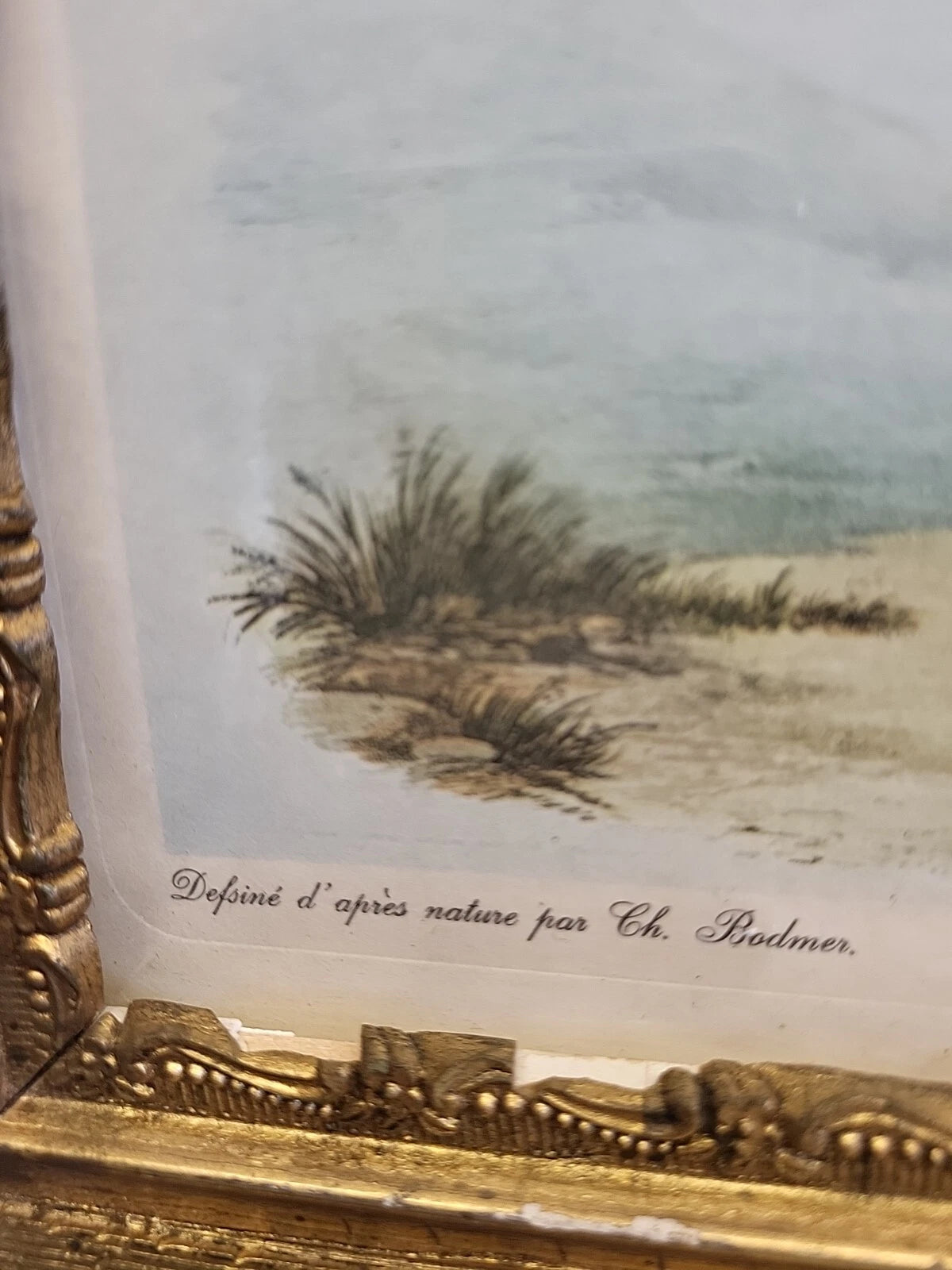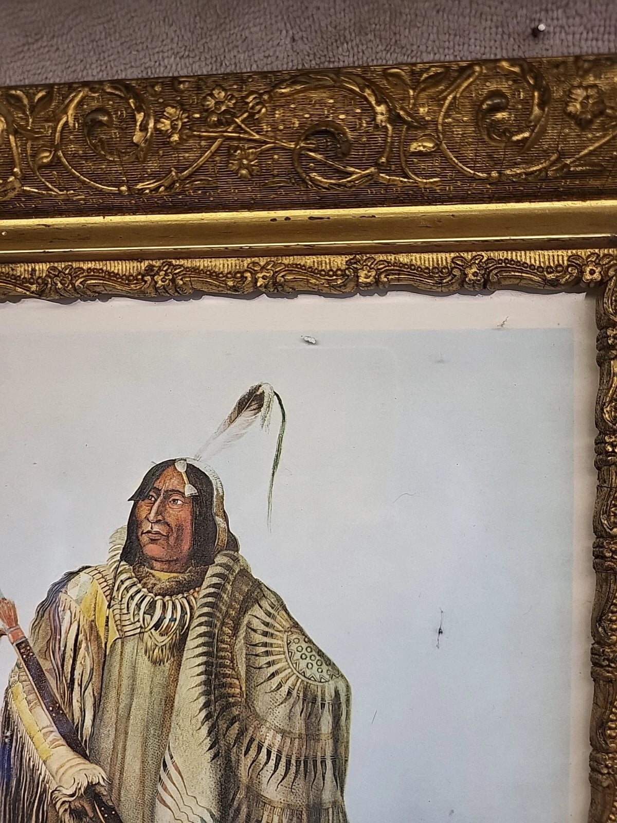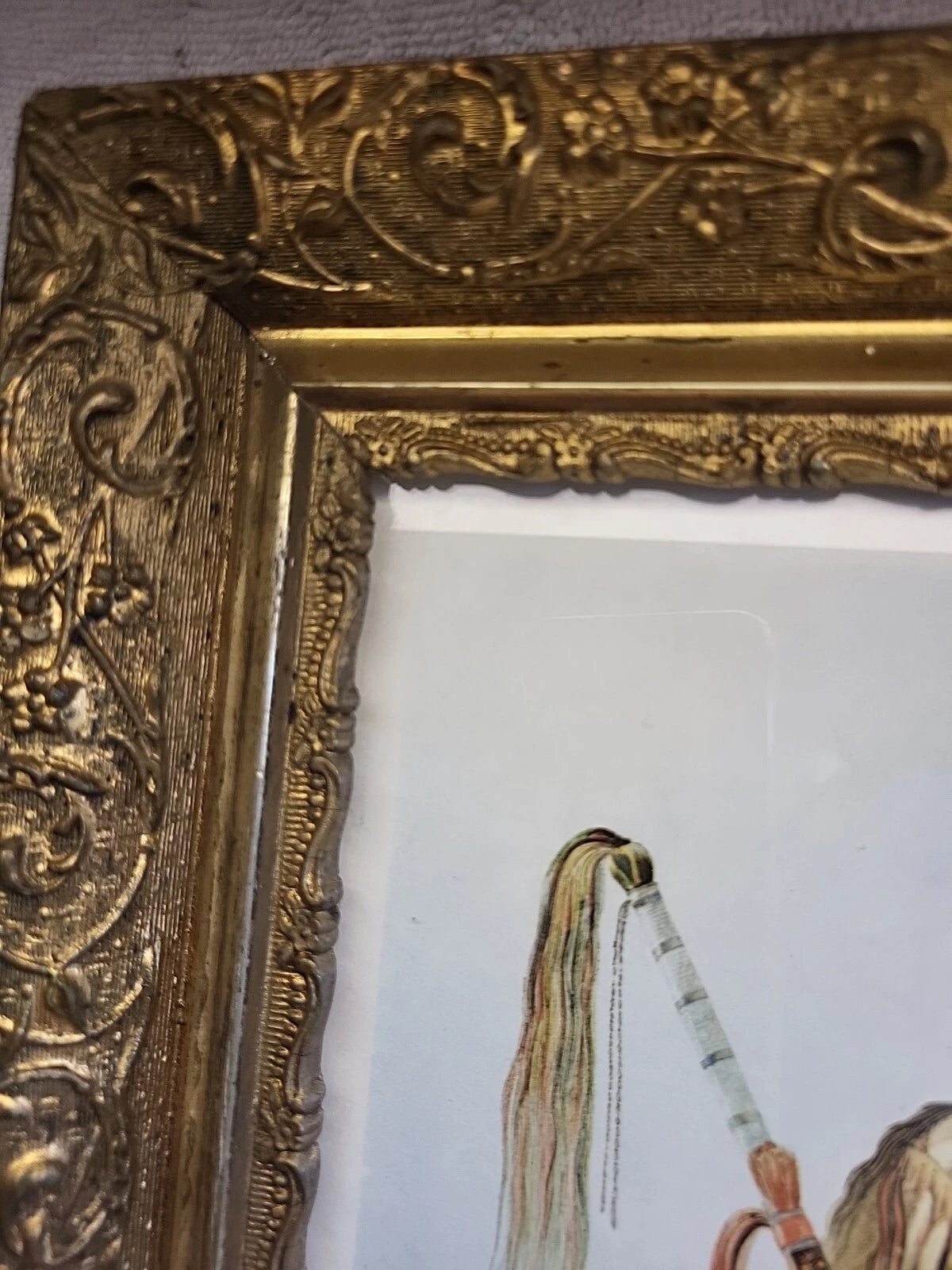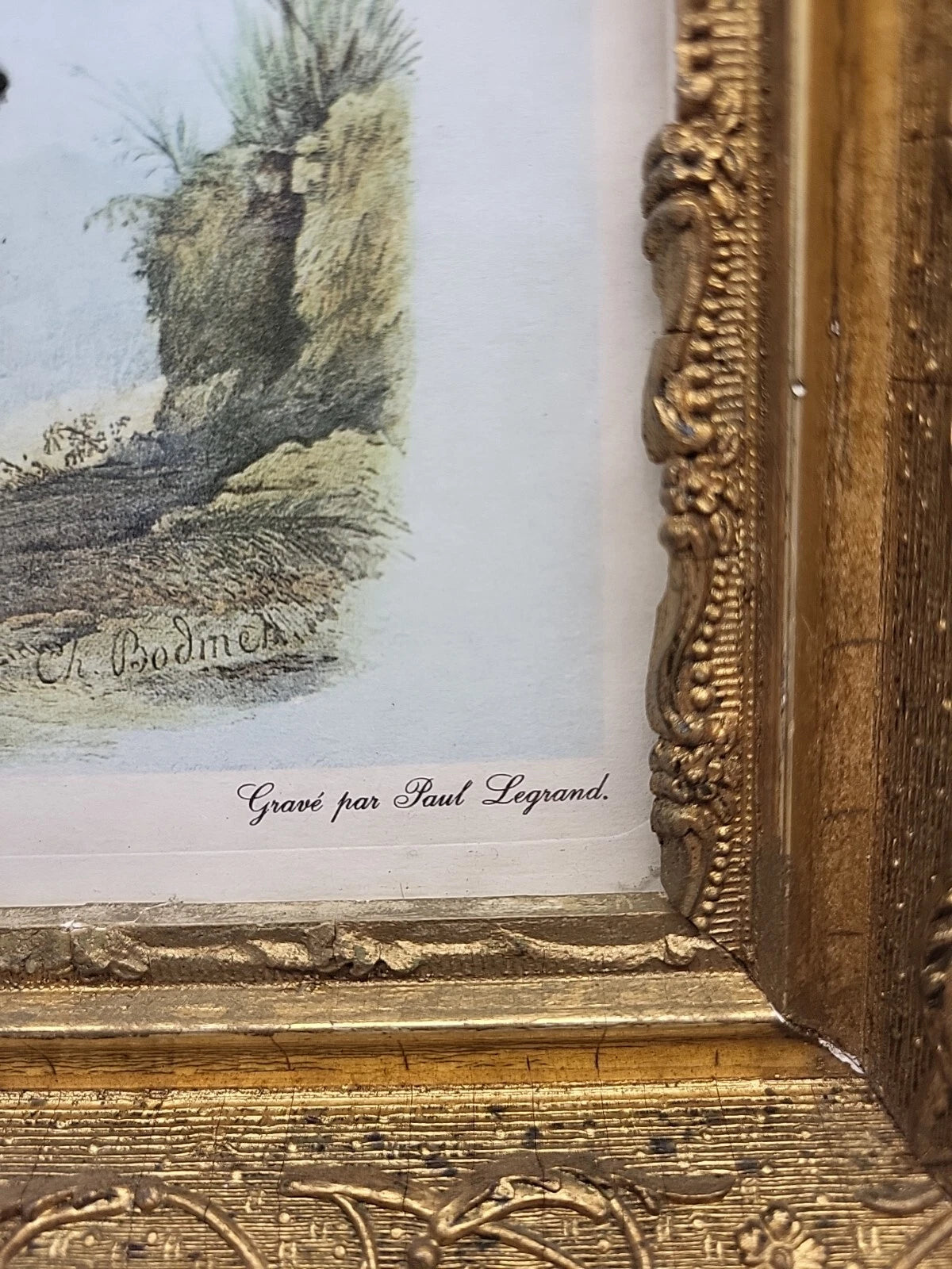 A very nice piece of art in an ornate frame. Print is in nice condition, some discoloration on the very edge. The frame has some chips in various places. The tape on the back could be replaced.