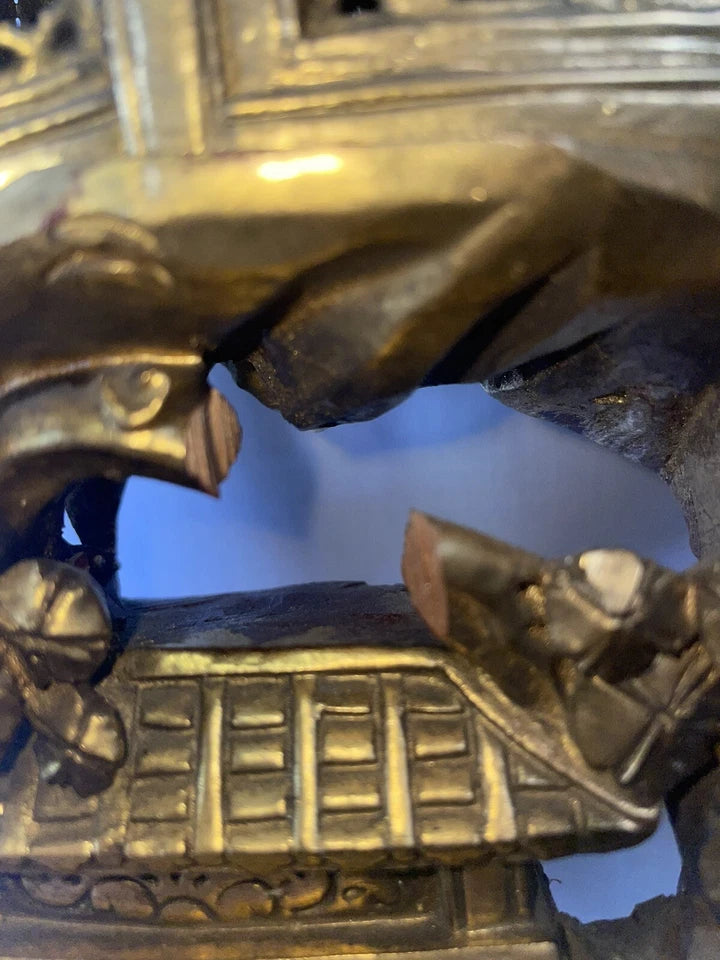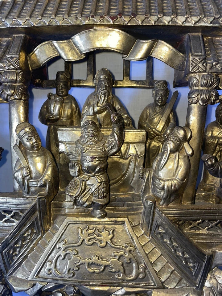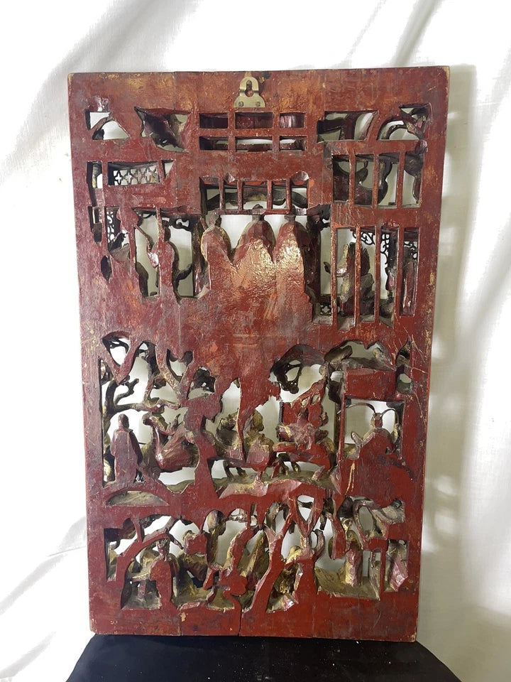 For your consideration is an exquisite antique rectangular Chinese carved deep relief gilt wood panel, depicting warriors scenes and a pagoda structure. This panel measures 25.5" high by 15.5” wide. It is in pretty antique condition with some gilt gold color paint loss, a few minor pieces missing and some cracks , as shown on the posted photos. Overall really nice condition for its age.