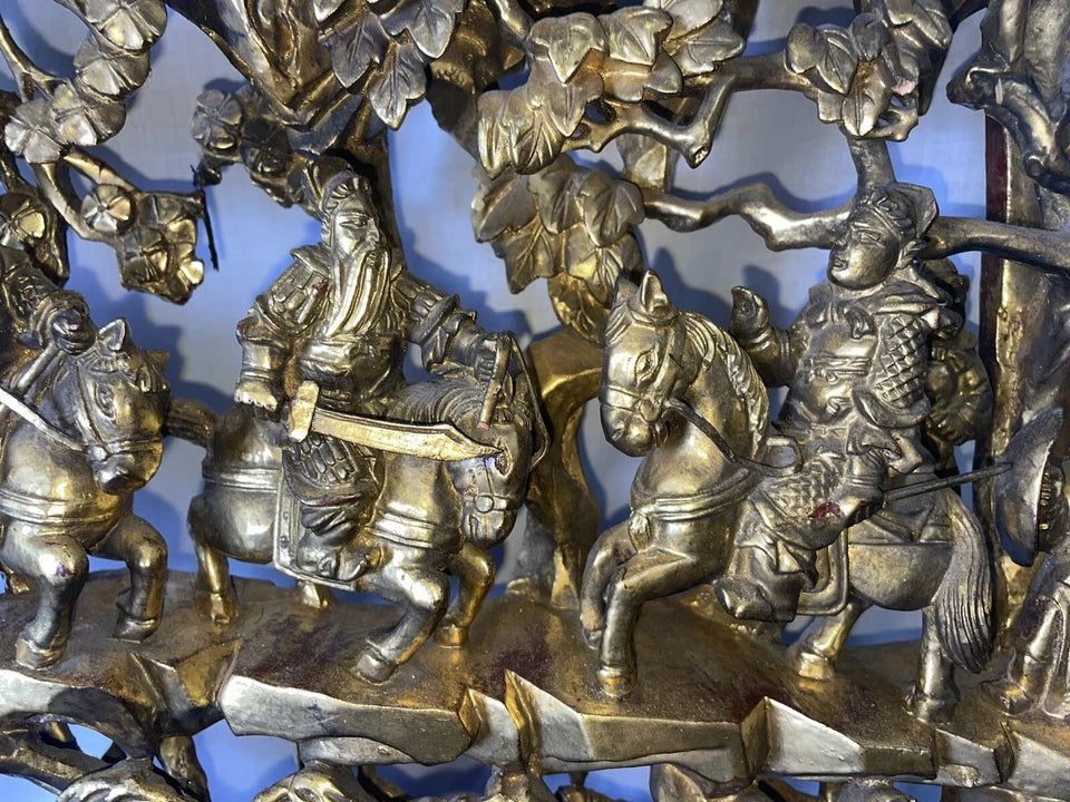• Load image into Gallery viewer, Antique 25.5" Chinese Carved Deep Relief Gilt Wood Warriors Scenes Panel !!