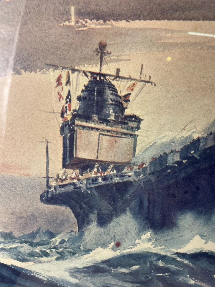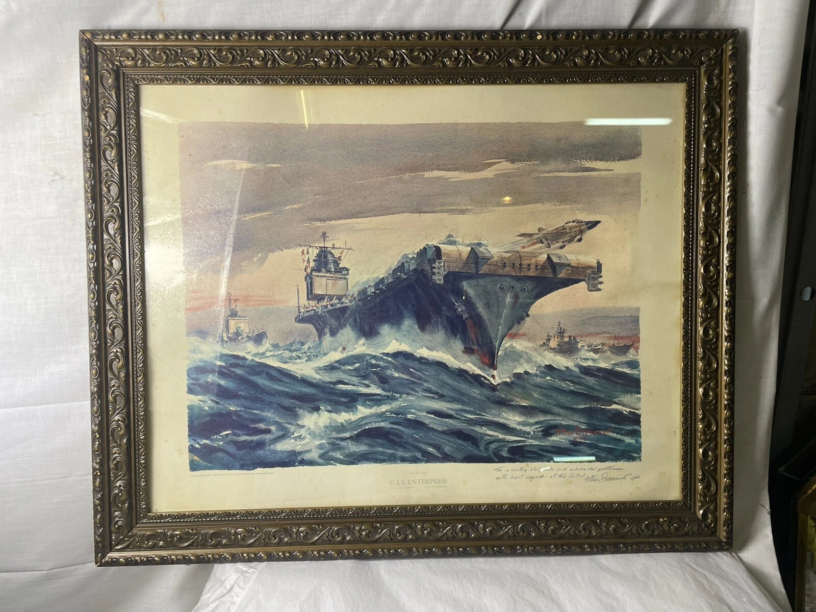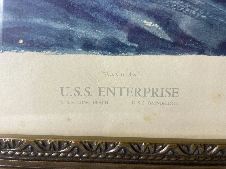Print by Arthur Beaumont entitled "USS Enterprise" inscribed and presented by the artist to “a worthy shipmate” in 1965.