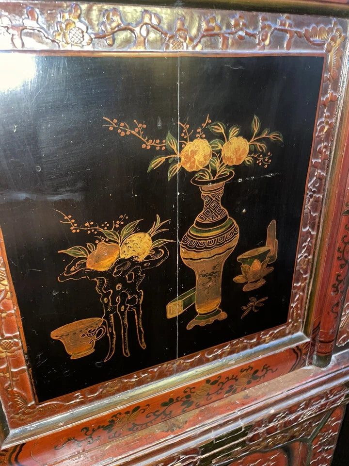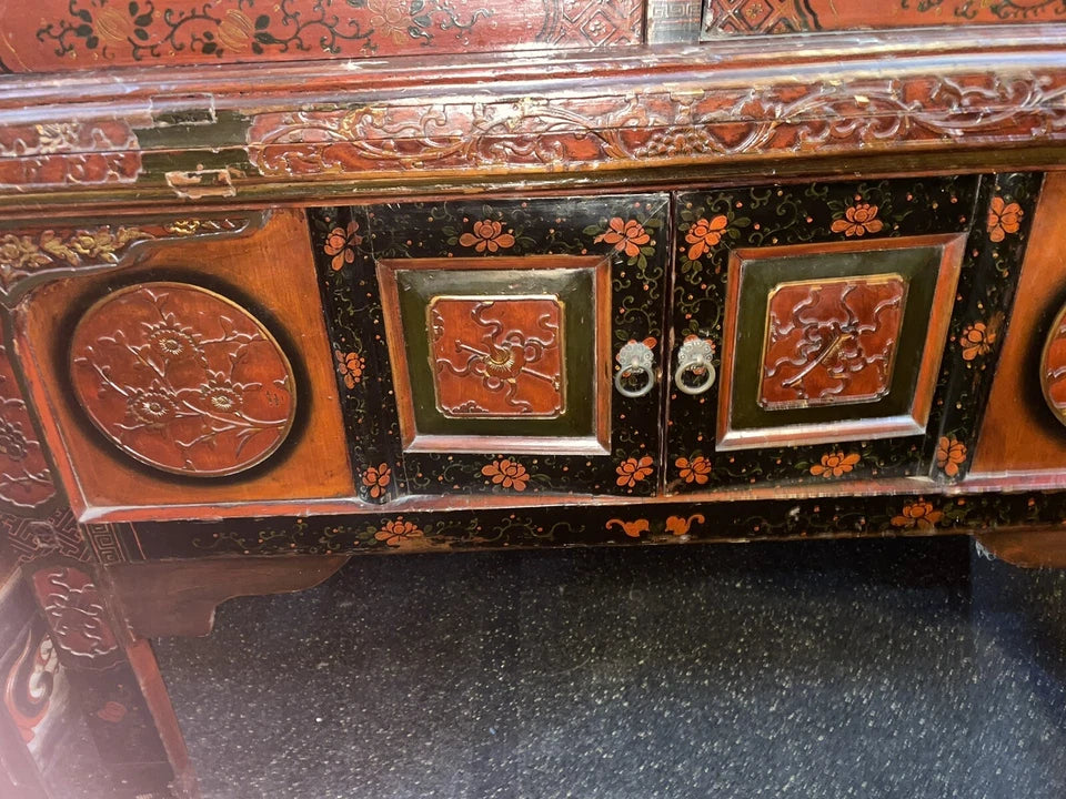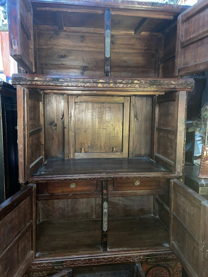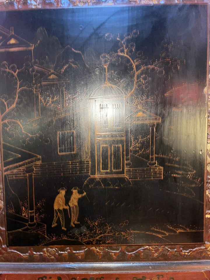 cabinet from the 19th century. It has a lot of carving and wonderful butterfly lock plates. There even appears to be a scene of westerners and a western style building with the dome in the center left panel. Very unusual.