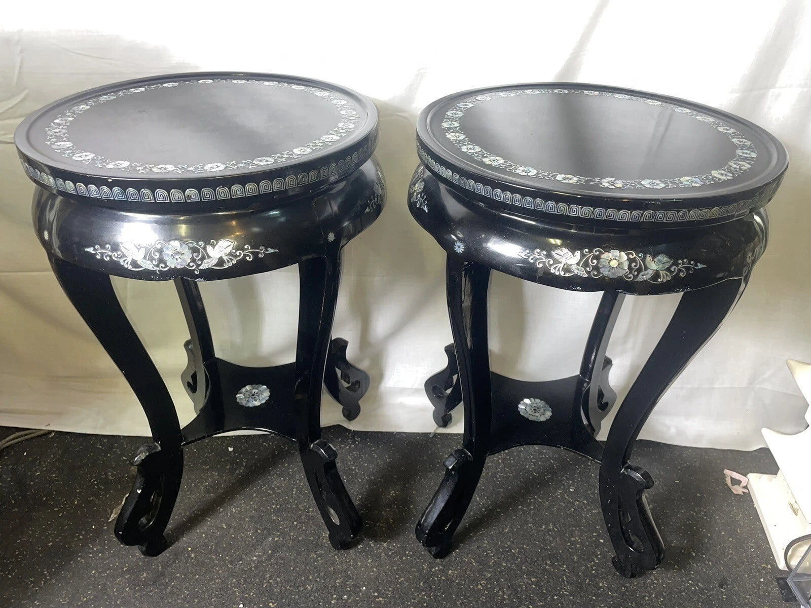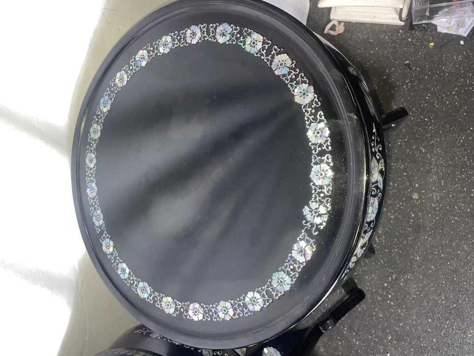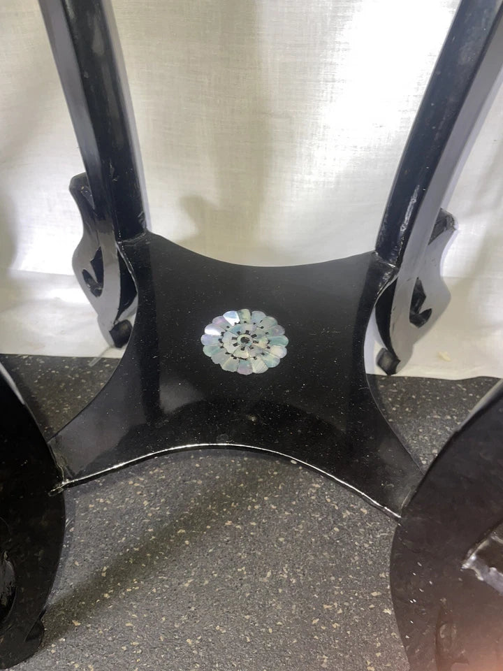 These vintage black lacquer Chinese tabourets are exquisitely crafted from wood with mother of pearl inlay rosettes. The unique design and intricate detail of these tabourets make them a standout piece for any collector. Made in China, these pieces showcase the skilled craftsmanship and attention to detail that is characteristic of Chinese art. Add these beautiful tabourets to your collection and appreciate the beauty and significance of Chinese culture.