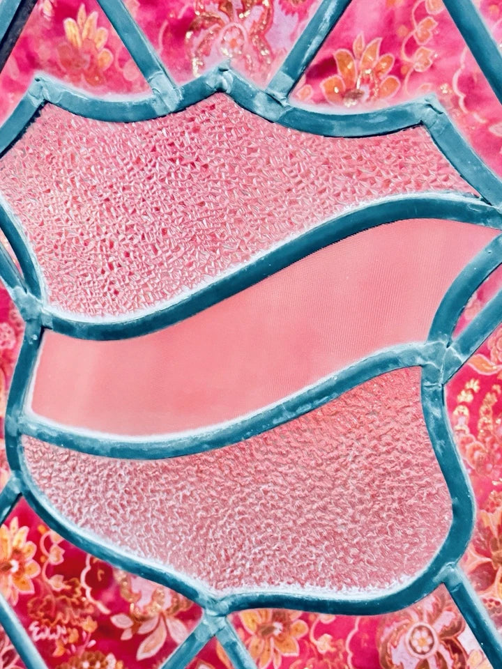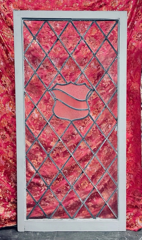 Large vintage leaded stained glass window panel featuring a central shield-style crest in pink glass, surrounded by a classic diamond lattice pattern.