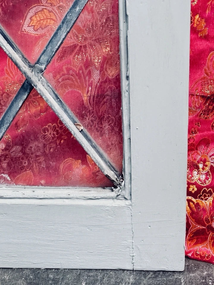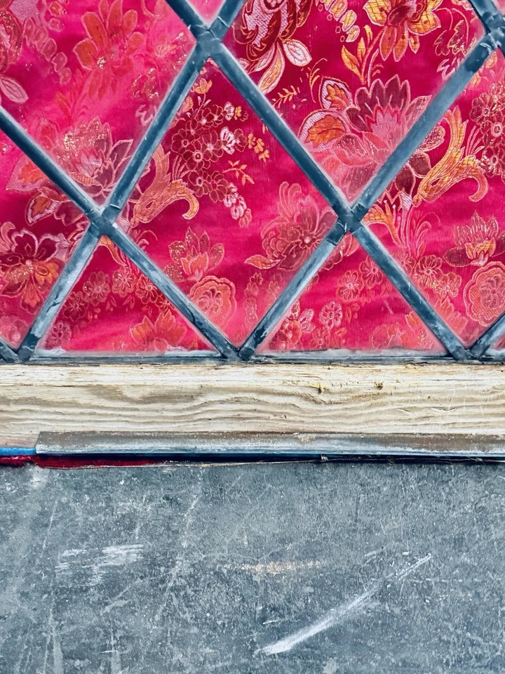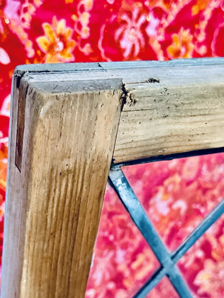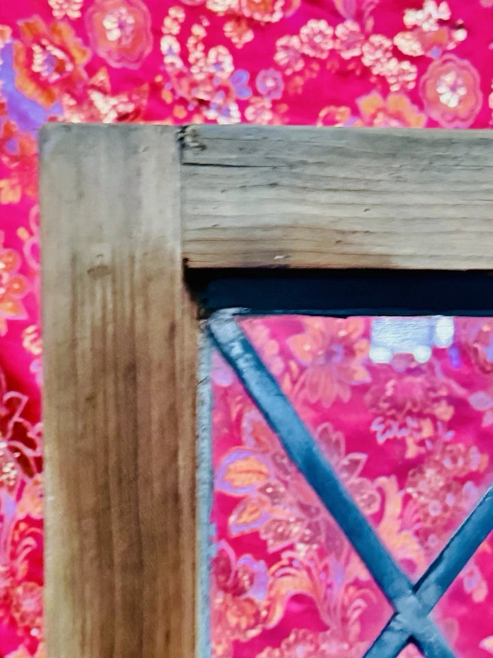 One diamond-shaped pane has a visible crack (see last photo), but the panel remains structurally sound and visually striking. The wood frame is solid with age-appropriate wear. Ideal for restoration, architectural installs, or as a statement art piece.