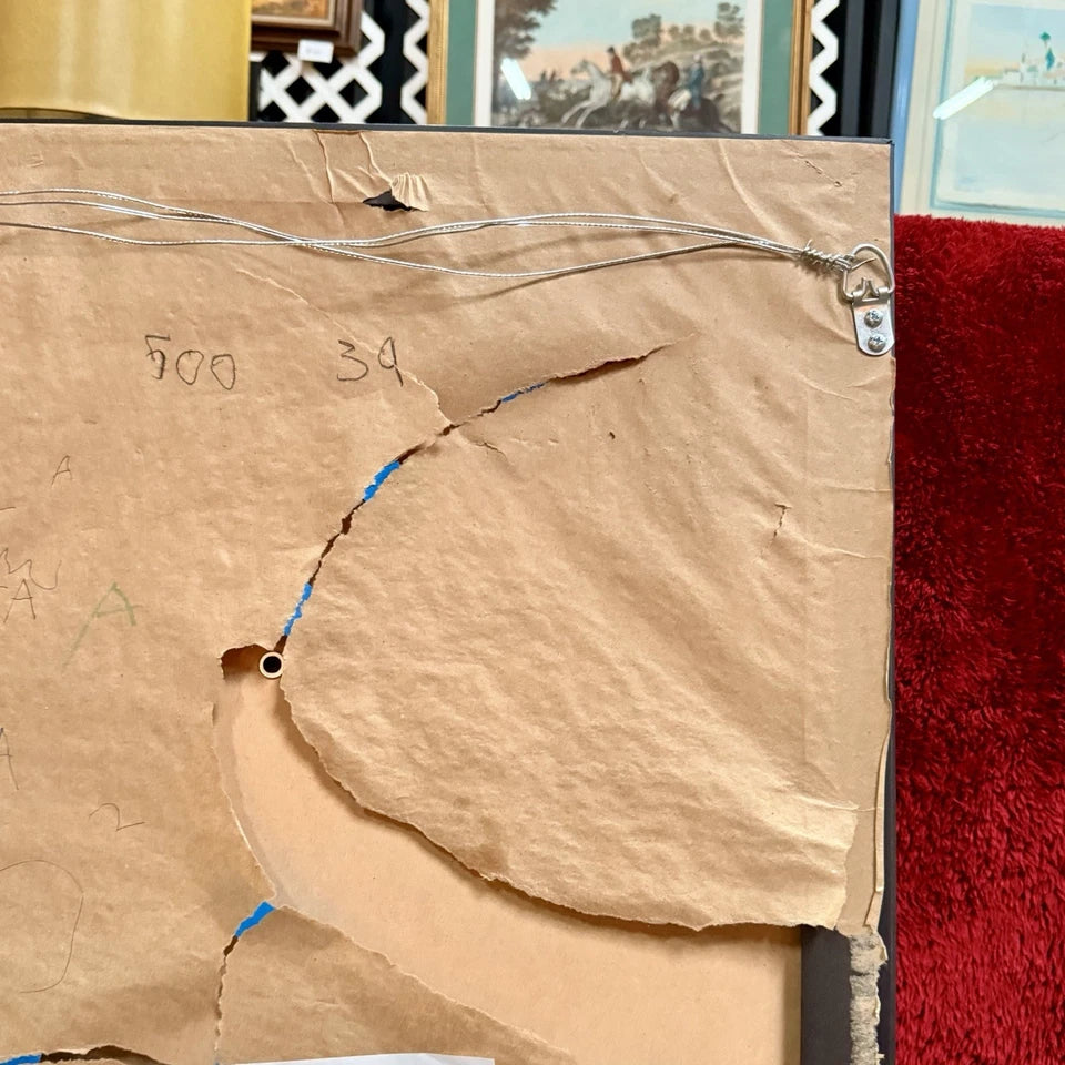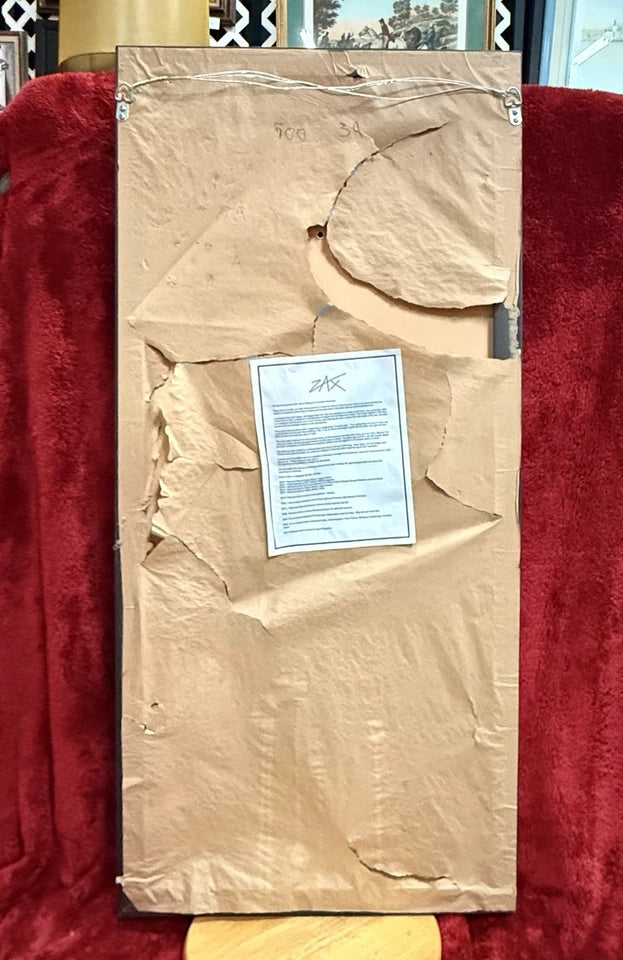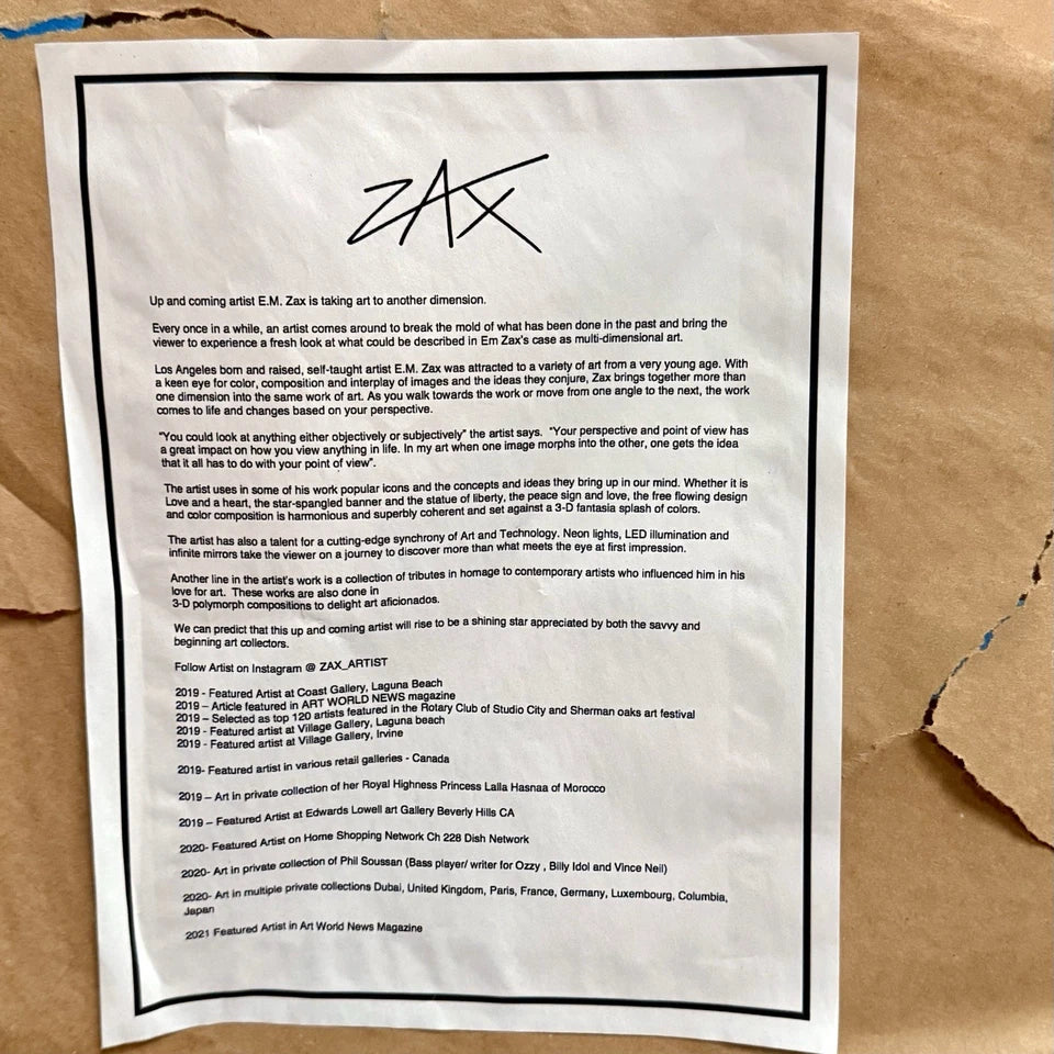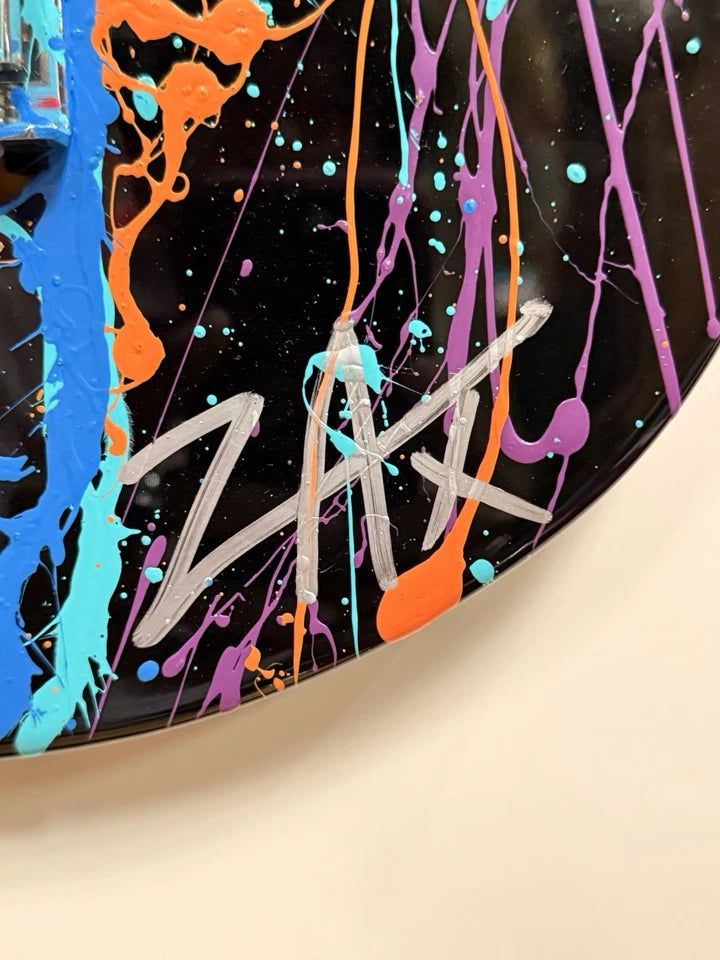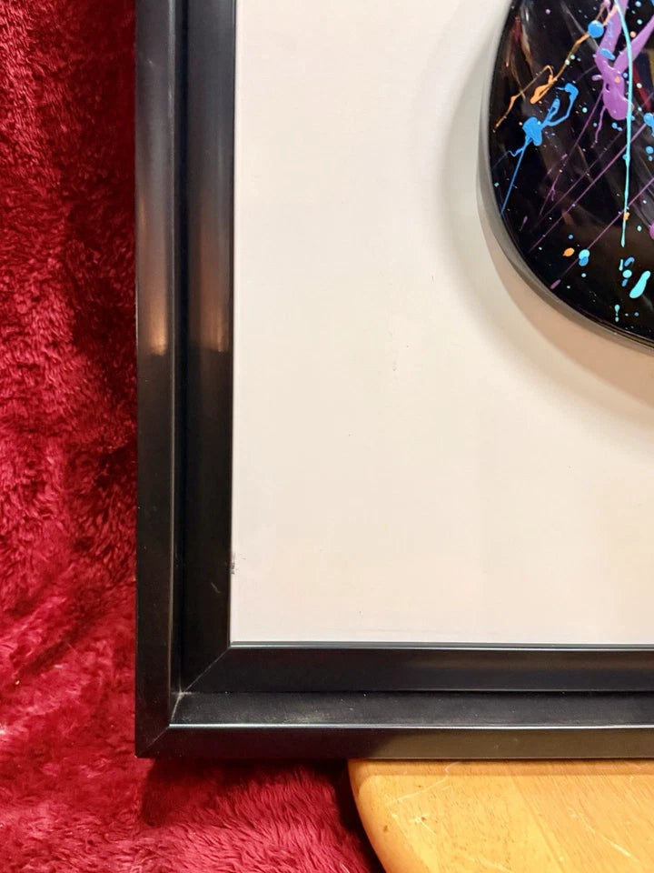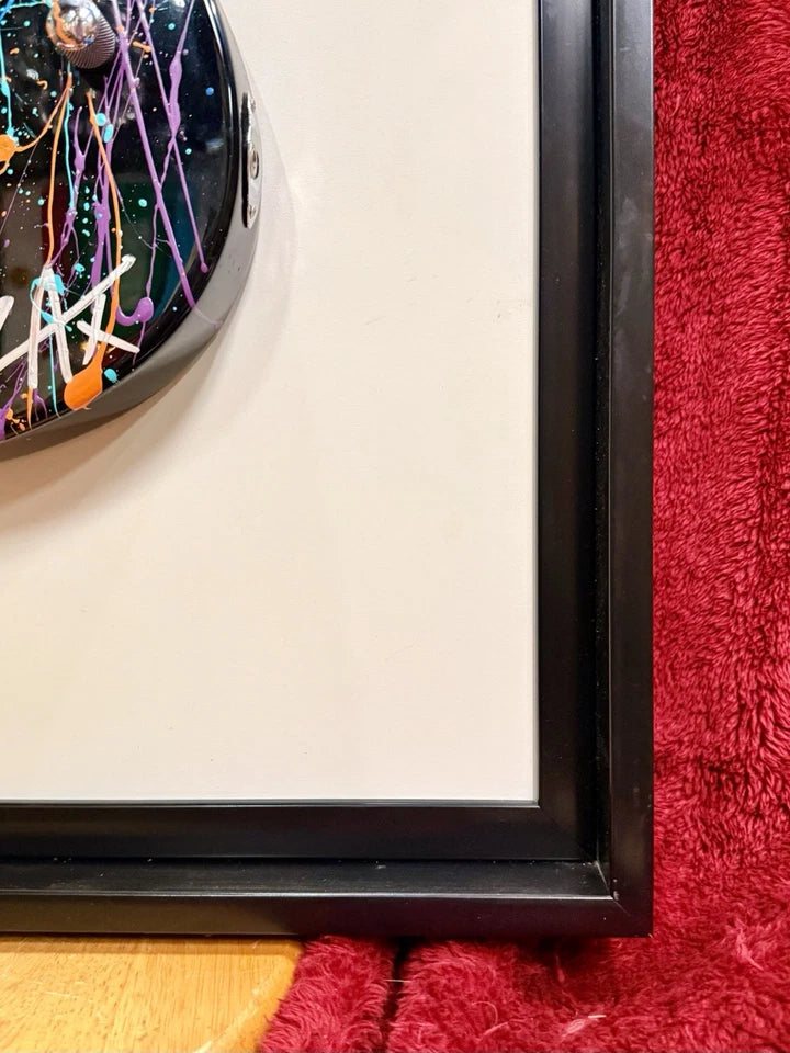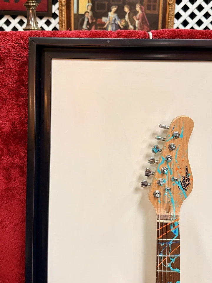 This is a one-of-a-kind, original acrylic painting on a new Rogue Rocketeer electric guitar by E.M. Zax. The frame is 24 inches in length and 48 inches in height, with a thickness of 2 inches. It is framed and ready to hang. The painting features abstract, contemporary art styles and a music theme, with the guitar serving as the painting surface. The artist is E.M. Zax and the painting is signed by the artist.