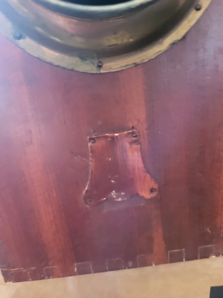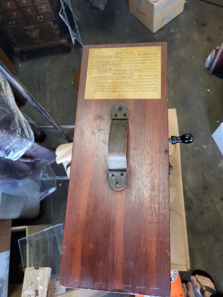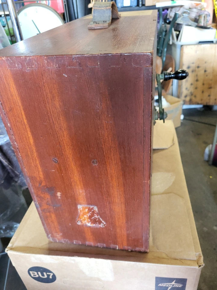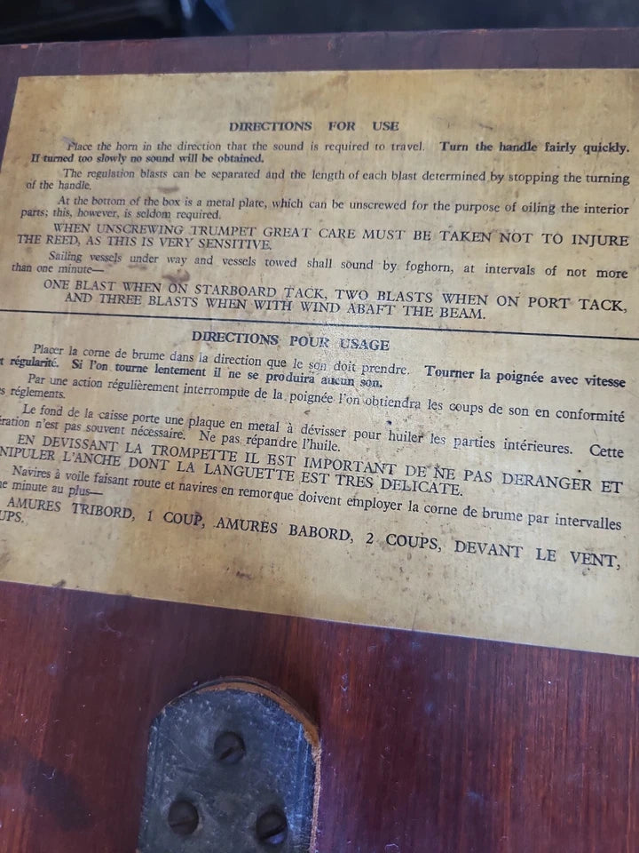 The pine box shows significant signs of age and ware, some of the wood is chipped and peeled away. There are scuffs and scratches. The interior appears to be complete, however the foghorn when cranked, does not sound is quite horn like.