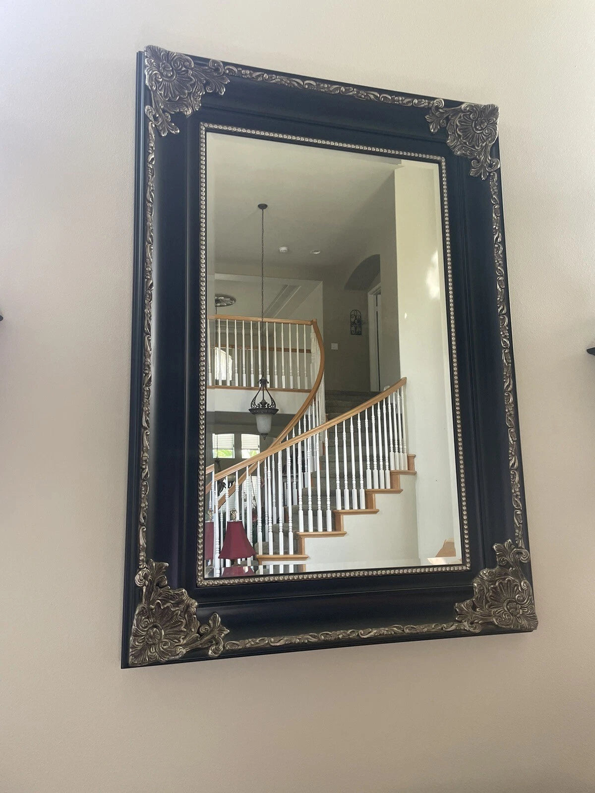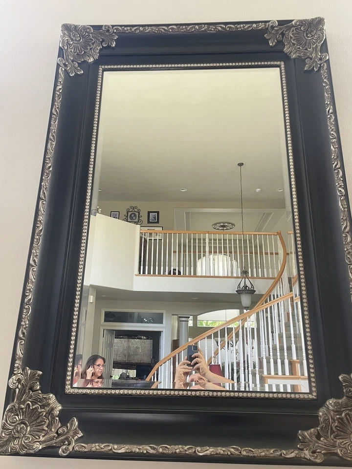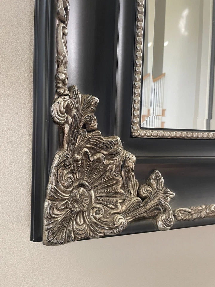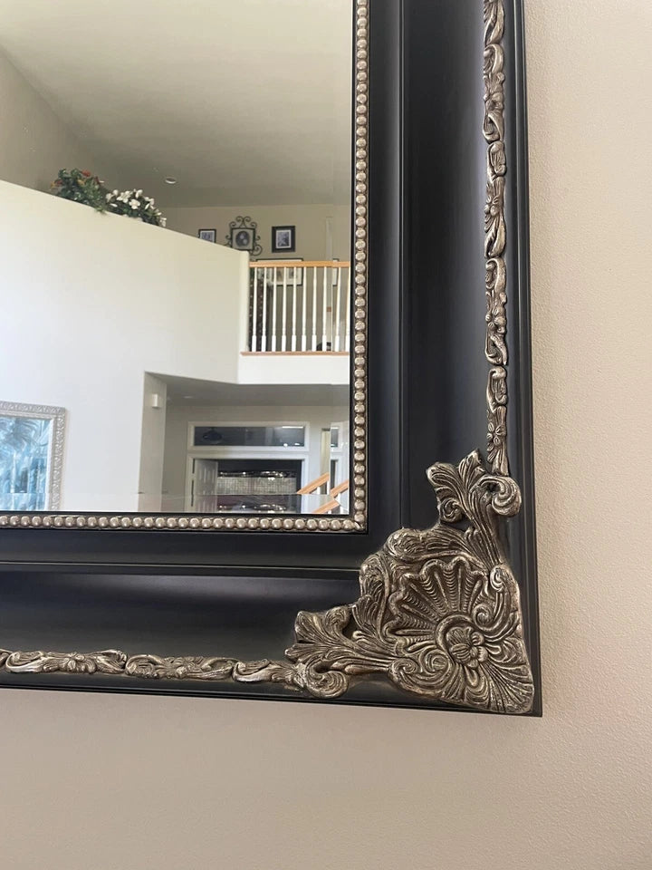 With a measurement of 73" in height and 61" in width, this ornate mirror is sure to be a statement piece in any space. The beveled edge adds a touch of sophistication to the piece. This mirror is a perfect addition to any modern or traditional home decor.