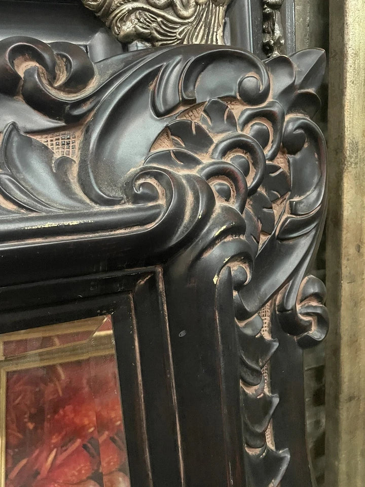 Add a touch of elegance to your home with this Extra Large Ornate Black Rectangular Beveled Mirror. The intricate design of the frame is made of fairly lightweight poly resin foam making it much lighter and easier to hang