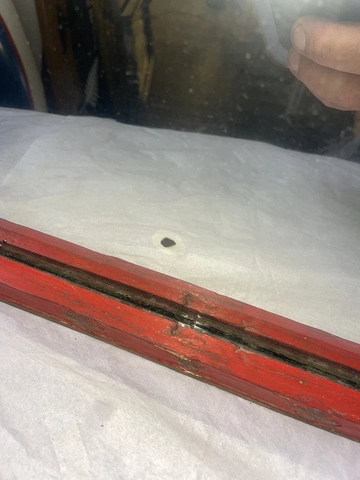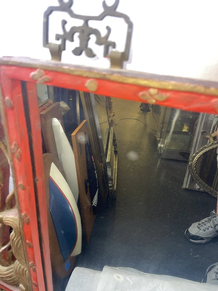This Large Ornate Antique Chinese Mirror is a unique piece that will add character to any room. The mirror is framed in a beautiful wavy red wooden frame which adds to the antique charm. The mirror measures 29 inches in height and 38 inches in width with a thickness of approximately 2 inches.