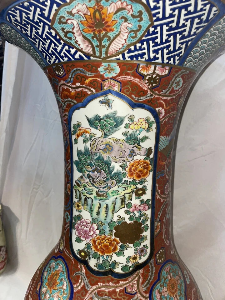 This is a late 19th century tall Japanese Imari long neck ruffled edge rim ceramic vase from Arita, Japan. It is decorated with a combination of
