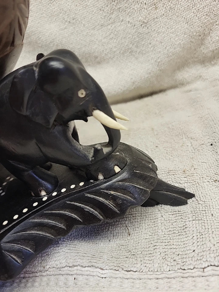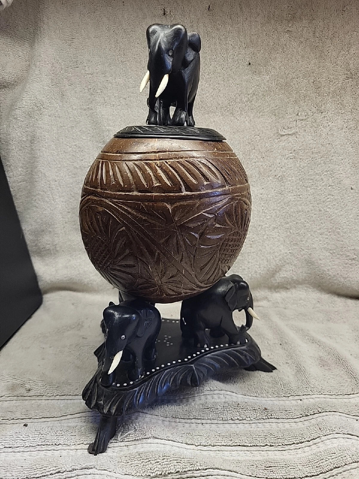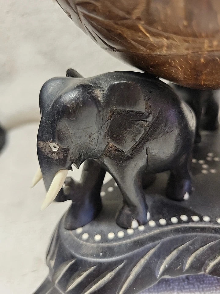 Anglo Raj carved coconut object d'art, the large coconut shell having finely incised decoration and an ebonized teak cover topped by a carved elephant finial, all mounted on an ebonized teak tripod base, the coconut supported by 3 similar ebonized elephants. One of the tusks is missing, and one of the foot pieces are loose but the screw is tight. Still a very unique and one of a kind.