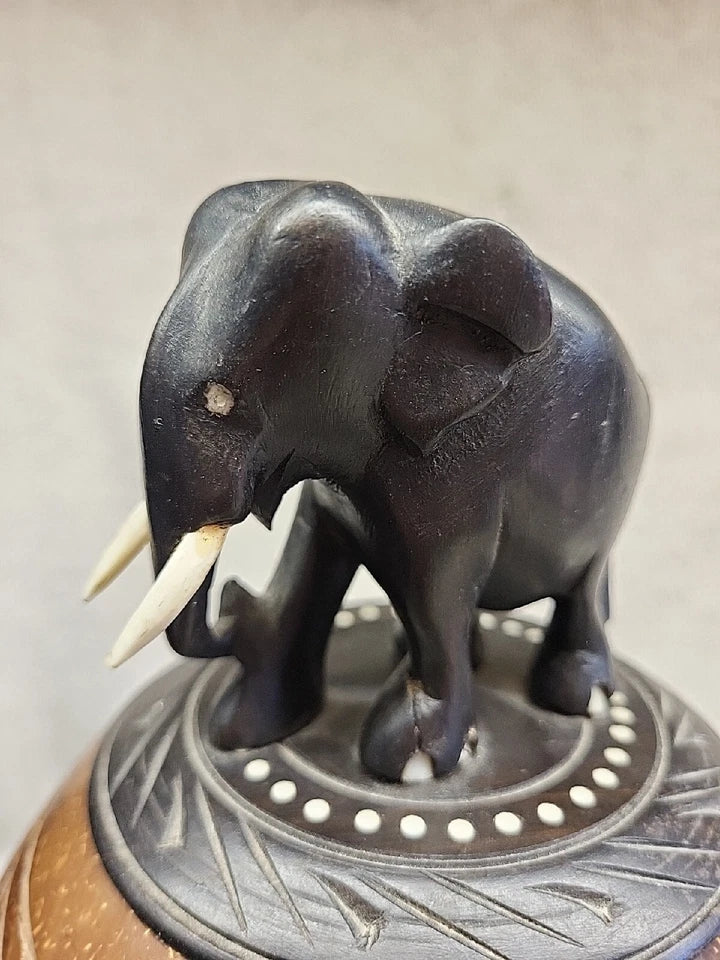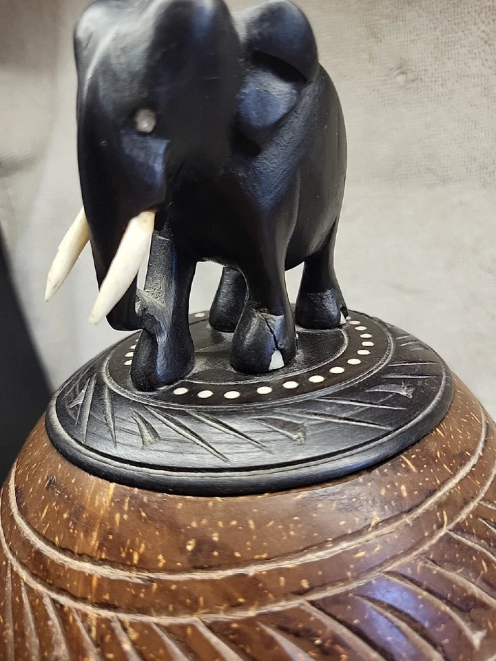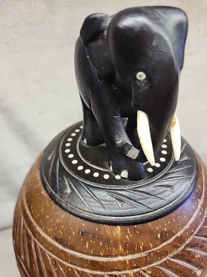 Anglo Raj carved coconut shell with elephant tobacco storage