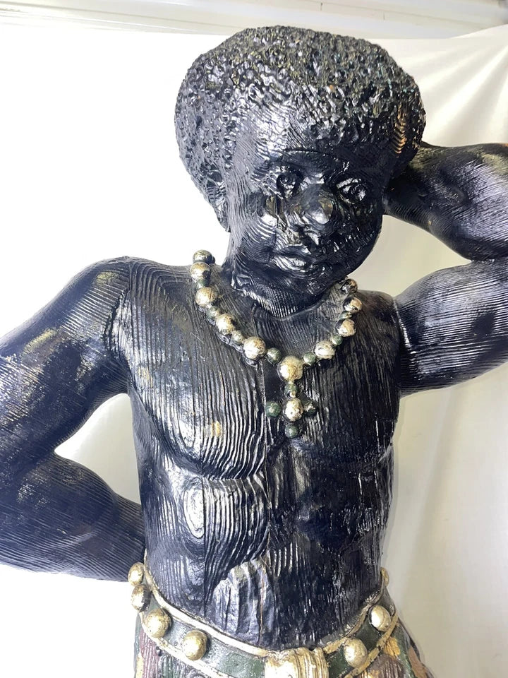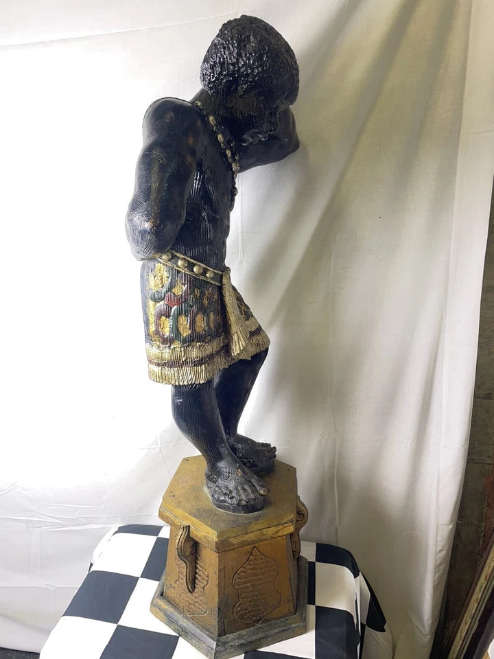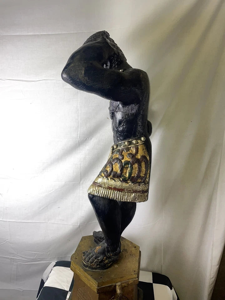 This is a lovely and probably Venetian/ Italian circa 1750 carved wooden statue figure known as 'blackamoor' statues.