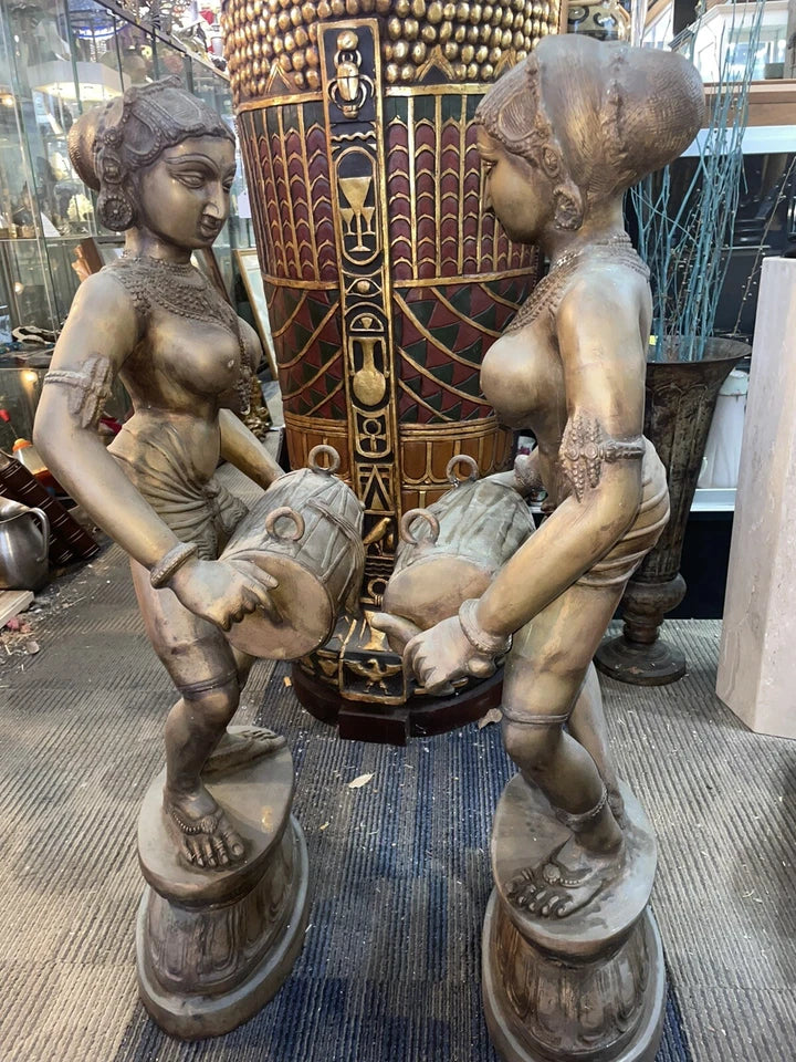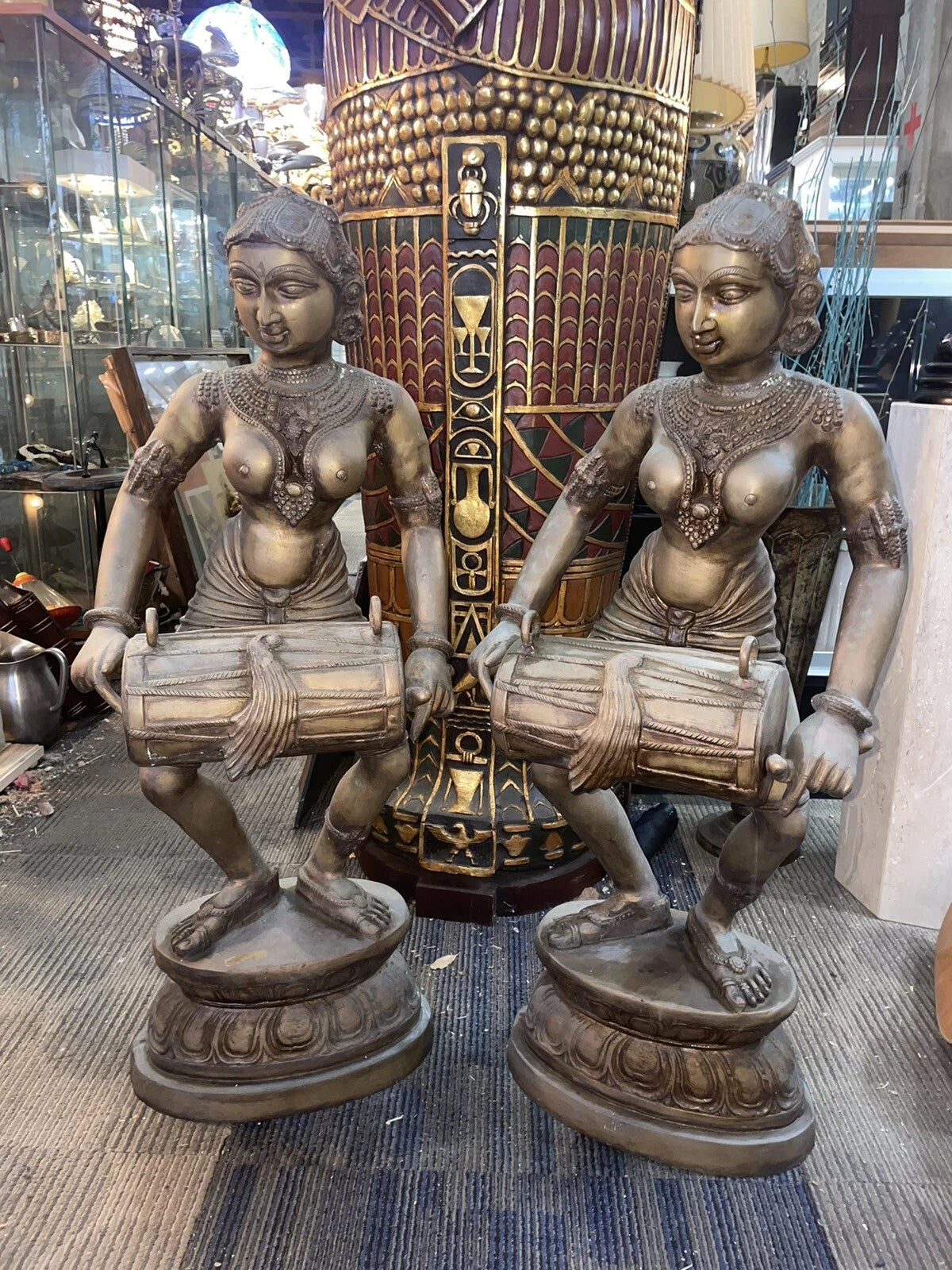 Vintage or possibly antique Aspara Musical Ladies Playing Dholak Indian Bronze Statues Rare.