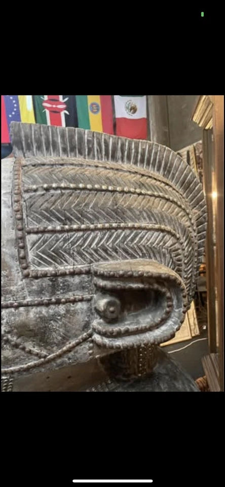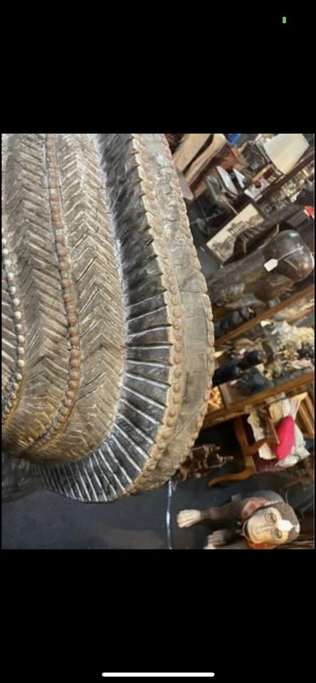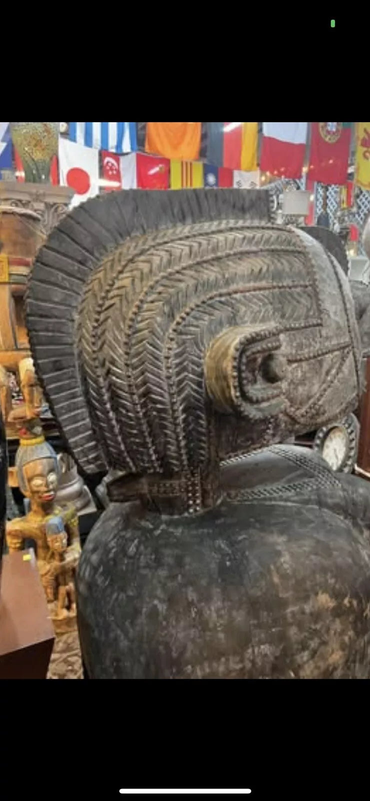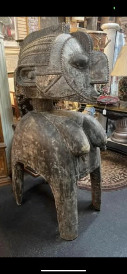 The D'mba or Nimba headdress is by far the most well-known Baga work of art. It is a bust of a woman on four legs and is worn on the head with a costume of raffia and cloth. It represents an older woman who has given selflessly and also represents Community. Its use was documented as early as 1886. There are many traditional components: sculpted hair, medial crest, flattened breasts, zigzag patterns.