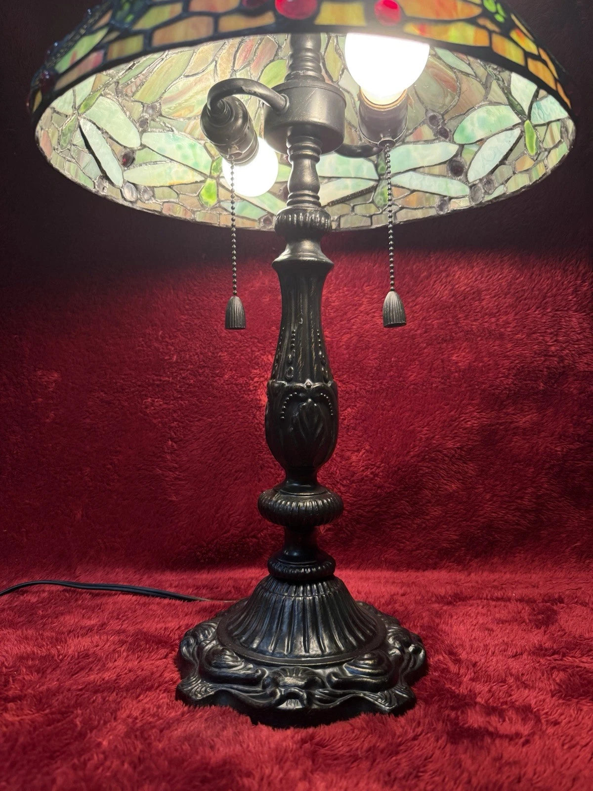 Add a touch of elegance to your home with this unique designed Tiffany style table lamp. The lamp features a beautiful stainless glass shade that will add a pop of color to any room. The lamp is corded for power and has a pull chain control style.