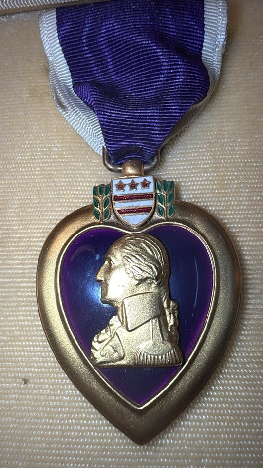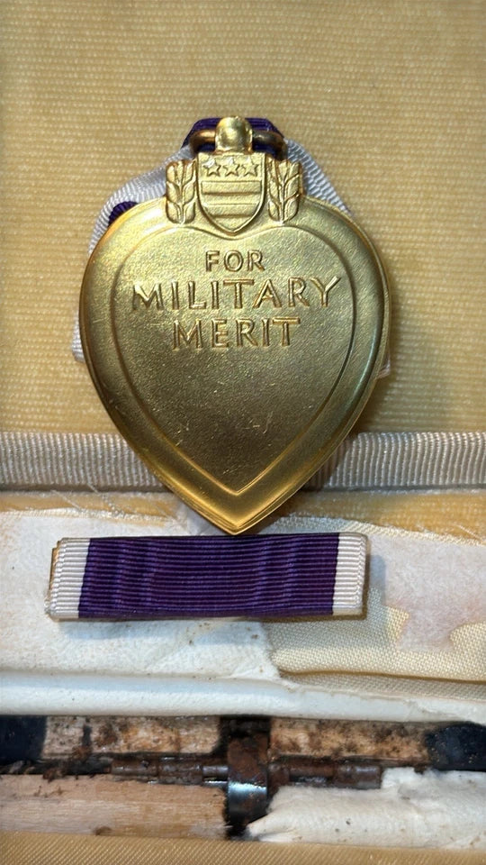 The product is an original World War II US Purple Heart Medal and lapel pin badge, housed in a coffin case.