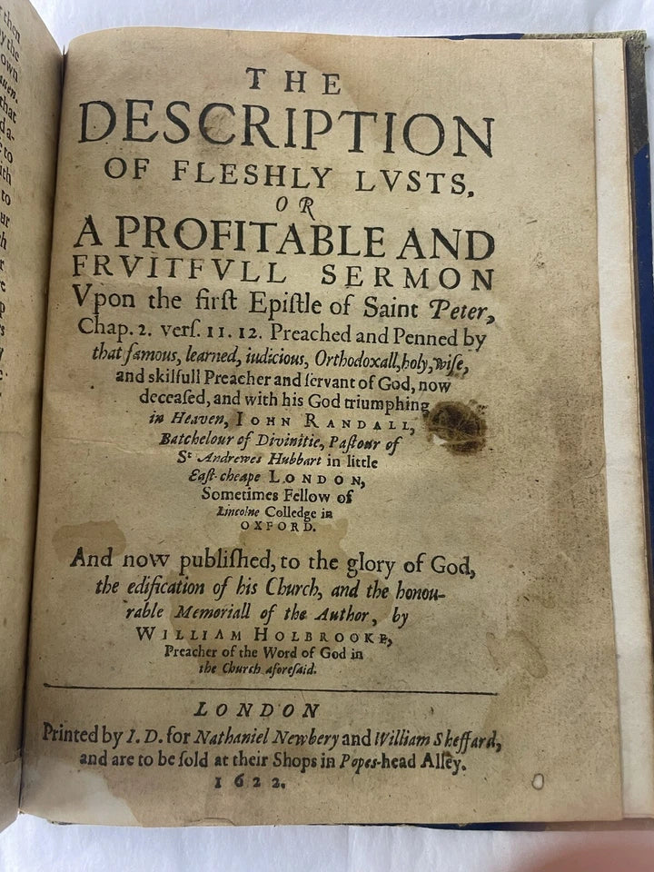 Sermons the description of fleshly, lusts and others, or a profitable and fruitful sermon written by John Randall and published by William Holbrook in London, 1622.