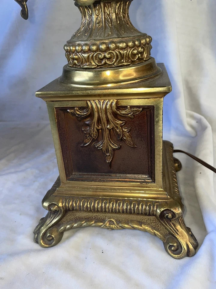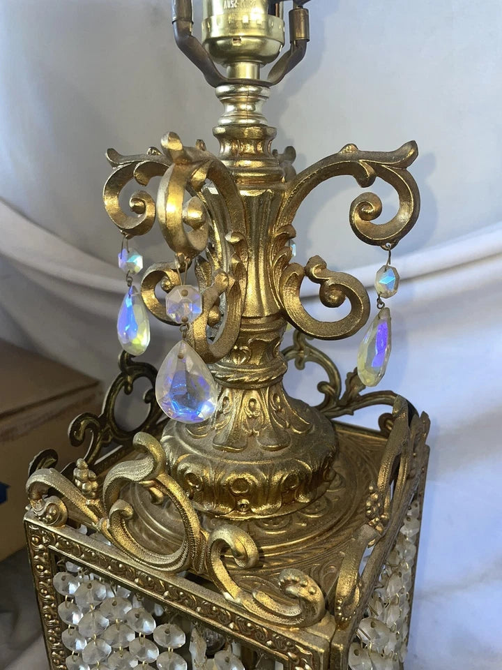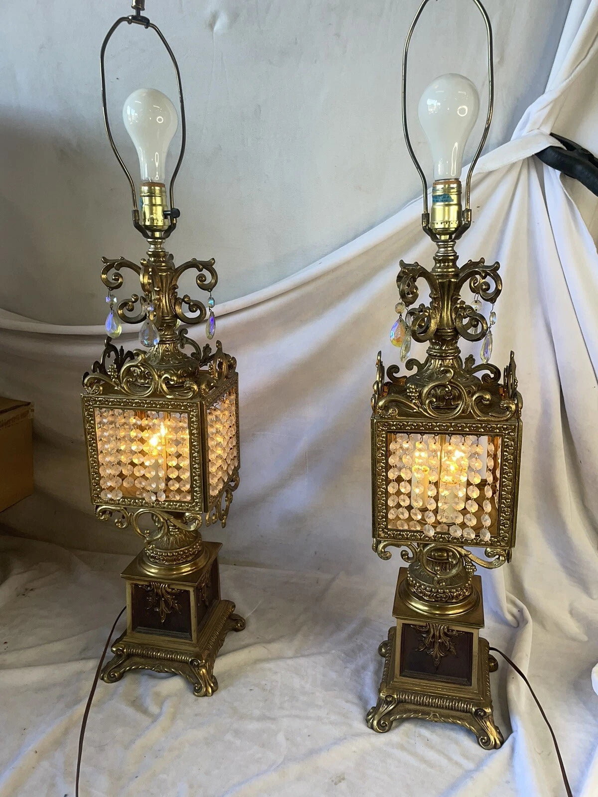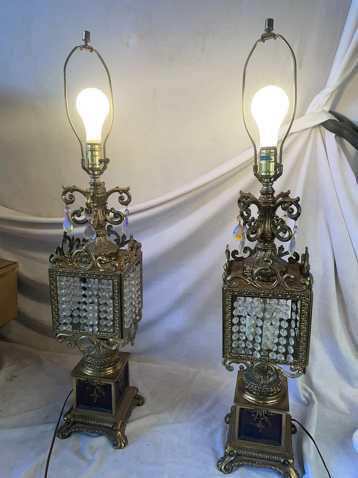Brass plated metal and clear crystal accents from the 1960’s. They stand approximately 41 inches tall and they weigh over 12 pounds each.